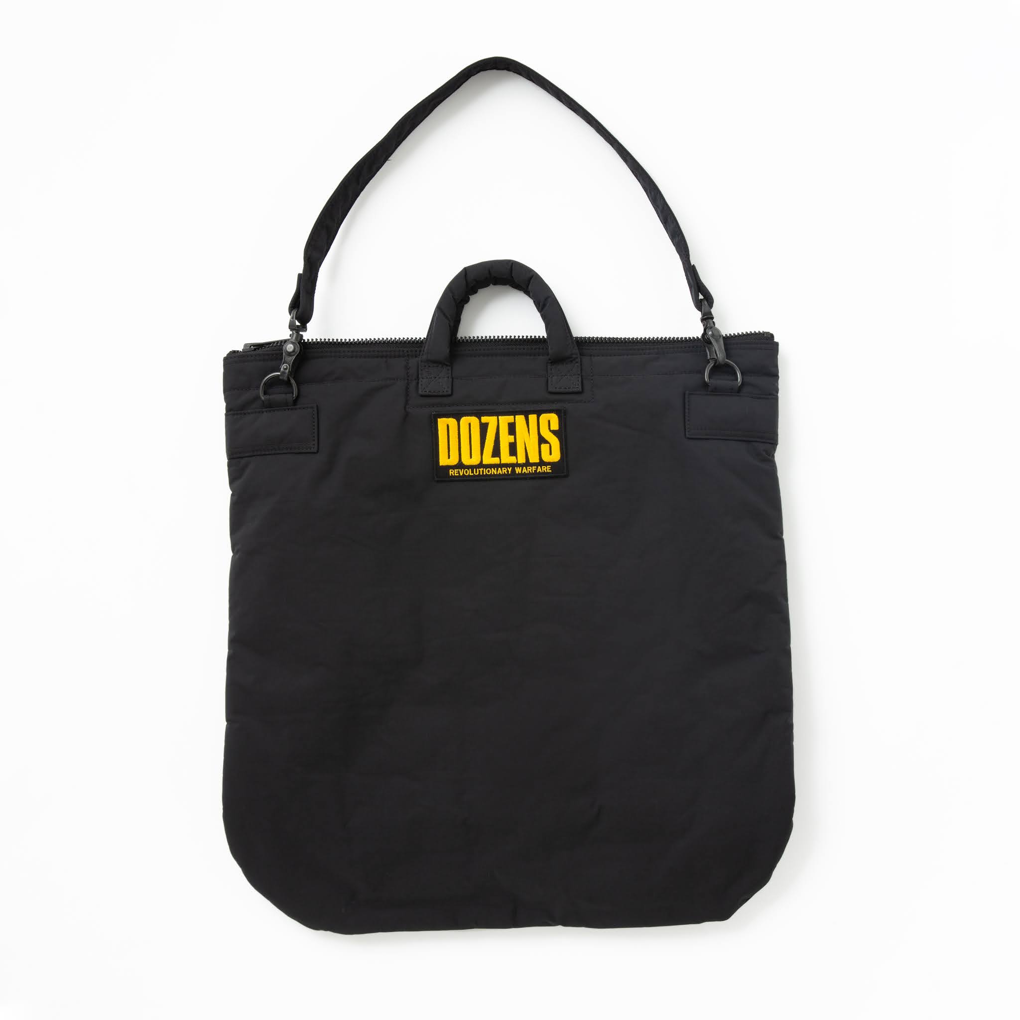 はっ水性のナイロンを使ったヘルメットバッグは、国産鞄メーカーの雄、ポーターに別注したプロダクト。シックなブラックボディに着脱可能なストラップを設けた、斜め掛けでも使える2WAY仕様。ワッペンでデコレートしたモデル。