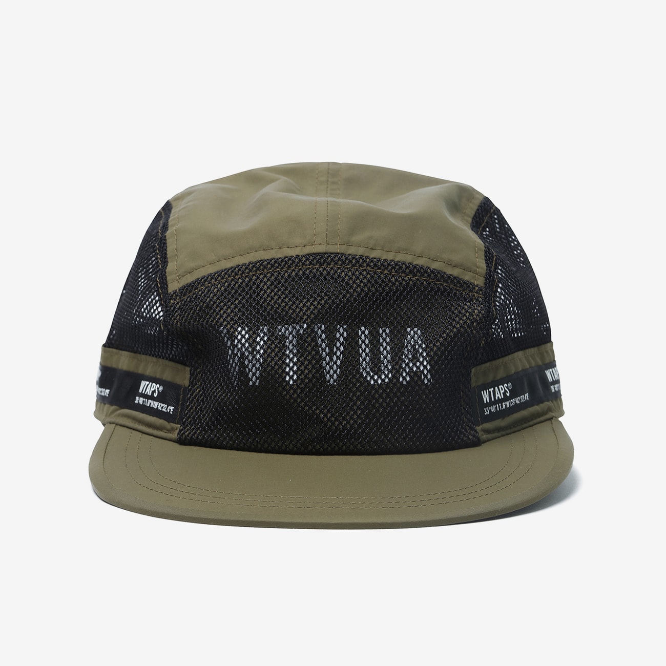 高密度のナイロンタッサーを使用した7パネル仕様のキャンプキャップ。フロントパネルメッシュ素材下側にプリントモチーフ。サイドパネルがメッシュの仕様でサイドパネル切り替えテープ上にWTAPSのロゴを配したテープをたたき付けた仕様。背面のベルクロアジャスターテープ部分に刺繍モチーフ。