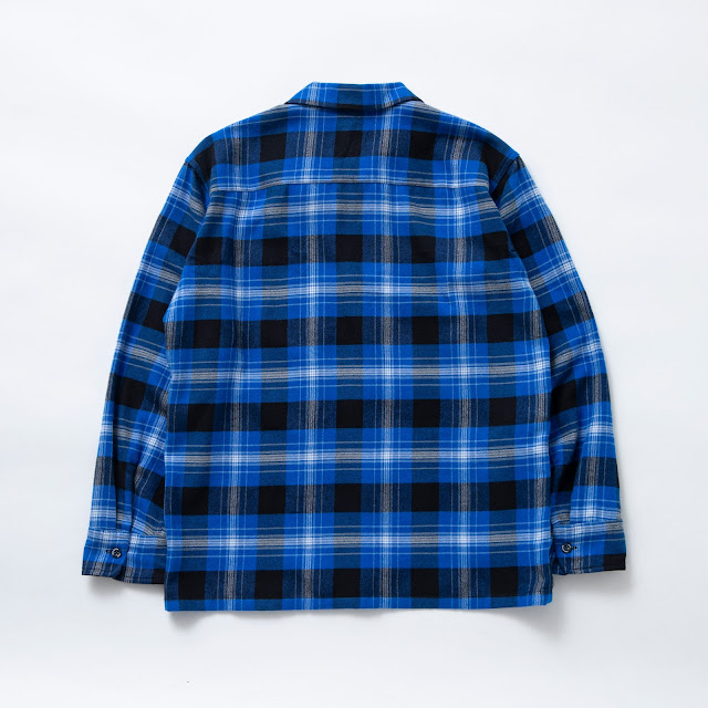 コットン/レーヨンの混紡素材を使用したオリジナルファブリックのブルーチェック柄オープンカラーシャツ。左胸にパッチポケット、ポケット脇にピスネームを付属したデザイン。ボタンもRATS、WAY OF LIFEのロゴをプリントしたオリジナル。ボックスシルエット。